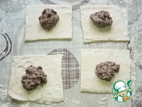 Пласт теста немного раскатываем и делим на 4 квадрата. |