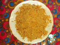 Для посыпки возьмём обрезки от коржа и любое песочное печенье, перемелем все в блендере в крошку. Также можно взять для посыпки вместо печенья измельченные орехи. Выложим посыпку на тарелку. |