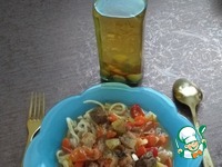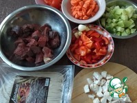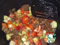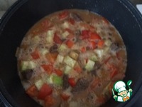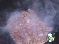 Я добавил кипяченной воды около 200-250 мл.. Конечно лучше добавить мясной бульон. Солим, перчим. Тушим под крышкой. Тушим в зависимости от мяса, до его мягкости. |