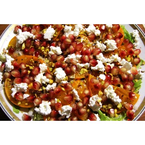 Затем, уложить тонкие кольца (или полукольца) спелой хурмы (у меня сорт "Королек"), кусочки сыра. Добавить мелко рубленые фисташки. |