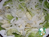 На блюдо уложить листья салата (порвать руками), пекинской капусты и посыпать полукольцами лука. Добавить половину салатной заправки и перемешать. |