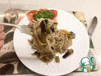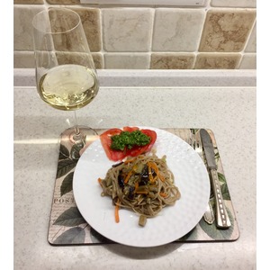 Я использую вот такую гречневую лапшу. Отварить 5-7 минут, слить и добавить к овощам. Хорошо перемешать. |