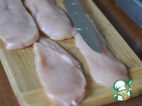 Куриные грудки нарезать на кусочки, как на отбивные. Можно использовать и свинину. Только нарезанные кусочки надо отбить. |
