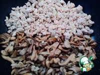 Грибы и 1 луковицу нарезаем и обжариваем. Отдельно от грибов обжариваем фарш и 1 луковицу. Солим перчим. Соединяем вместе. |