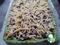 На испекшуюся основу выкладываем фарш с грибами, сверху натертый сыр. |