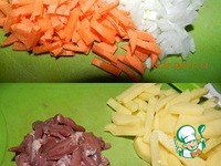 К овощам добавить сердечки, обжаривать вместе 10 минут, периодически помешивая. Затем добавить картофель и 3ст. л. с горкой риса и все вместе обжарить еще 3 минуты. |