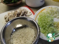 Рис промыть, грибы нарезать пластинами, лук, чесноки сельдерей мелко. |