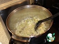Овощи (лук, чеснок, сельдерей) обжарить в кастрюле вместе с рисом в сливочном масле до мягкости овощей в течение 5 -7 минут Затем залить бульоном. |