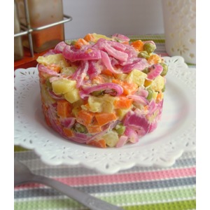 Описание: Идею этого салата присмотрела на польском кулинарном форуме. Салат из простого набора овощей и зеленого горошка. А яркий акцент в этом салате - красный лук, приготовленный в маринаде!