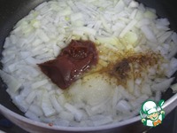 Затем добавить томат. пасту, сахар, перец чили, молотый кориандр (все специи регулировать под свой вкус!), перемешать и тушить 1 минуту |