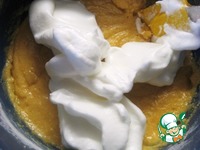 Вынимаем белки из холодильника и взбиваем со щепоткой соли до устойчивых пиков. Добавляем взбитые белки к тесту. Несколькими движениям вмешиваем их в тесто, долго не перемешиваем. |