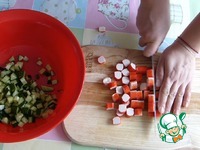 Крабовые палочки нарезаем кружочками (примерно 5 мм шириной). |
