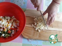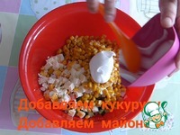 Добавляем консервированную кукурузу, 2 ст. л. майонеза (у меня сметанный майонез) и соль по вкусу. Перемешиваем. |