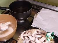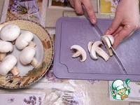 Тем временем очистим и промоем шампиньоны. Обсушим. Нарезаем пластинами по 2-3-мм. |
