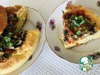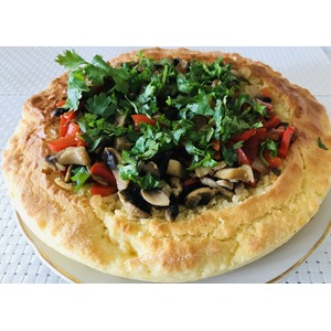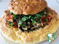 Булку заполнить начинкой. У меня жаренные шампиньоны, с луком, красным болгарским перцем и чесноком. Сверху присыпала свежей зеленью. |