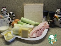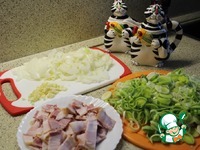 Нарезаю бекон полосками, лук - порей кольцами, репчатый лук - четвертинками колец, чеснок - мелко. |