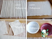 Каждый квадрат еще немного подкатала. Форму заполнить тестом, дно теста присыпать панировочными сухарями, чтобы при выпечки, оно не размокло. Заполнить начинкой. |