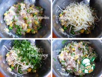 В миску выложить фарш, добавить яйцо, соль, специи, перемешать, добавить кукурузу без жидкости, зеленый горошек. Горошек из заморозки залить кипятком на 5мин, слить воду, промыть холодной водой. |