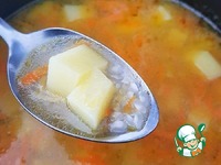 Добавить нарезанный кубиком картофель и промытый в холодной воде рис. Залить 400 мл. бульона (либо кипяток). Варить до готовности картофеля и риса. |