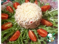 На тарелку положить листья фризе (одуванчик), в кольцо выложить салат, сверху посыпать оставшимся сыром, украсить помидорами черри. |