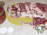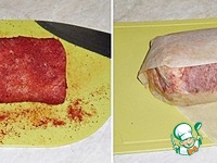 Постараюсь рассказать как можно подробнее. Мясо предварительно промыть, обсушить. Подготовить пласт мяса. Я взяла внешнюю часть корейки. Но можно взять любое, главное чтобы был ровный пласт. Мясо отбивать НЕ надо. Те кусочки мяса, которые "выпирали" или провисали по краям, я срЕзала и потом вложила во внутрь рулета. Подготовленное мясо посыпать хлопьями паприки, сахаром, чесночным порошком, горьким перцем и размятыми таблетками аскорбинки (я сделала это плоской стороной ножа), посолить по вкусу, в среднем соль берется из расчета 1 ч. л на 1 кг мяса. Если вы любите соленое мясо - можно посолить покрепче. Аскорбиновую кислоту я взяла в аптеке, самую обычную с глюкозой. Вычитала в инете, что её можно использовать вместо нитритной соли. Кроме того, она играет роль консерванта. |
