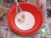 В миску вливаем молоко, добавляем яйца и соль. Перемешиваем. |