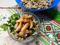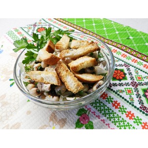 Начнем с приготовления сухариков. Нарезаем батон длинными кусочками небольшого размера, помещаем их в пакет. Добавляем немного соли и специй (хмели-сунели, паприка, молотый кориандр и другие по вашему вкусу). Пакет завязываем и легонько трясем, чтобы специи равномерно распределились по хлебным кусочкам. Высыпаем их на противень и подсушиваем в духовке до золотистого цвета, минут 15.