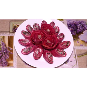 С одной стороны делаем надрез. Внутренний край блина смазываем плавленным сыром. На край выкладываем кусочек сельди и сворачиваем по кругу в форме розочки. |