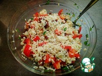 Булгур, томаты, базилик, перец и сыр смешиваем в миске. Заправляем оливковым маслом (можно добавить также масло от томатов), добавляем по вкусу соль, перец, чесночный порошок, специи. |