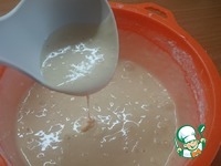 Добавляем теплое молоко, перемешиваем. Добавляем масло, перемешиваем. |