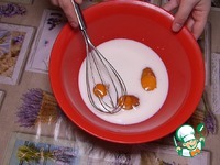 В миску вливаем теплое молоко (я разогрела в микроволновке, можно достать заранее из холодильника), добавляем яйца и сахар. Перемешиваем. |