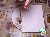 Украшаем. Блюдо для подачи накрываем листом А4 наполовину. На вторую половину выкладываем чайную ложечку. Посыпаем какао. Затем аккуратно убираем ложку, лист. |