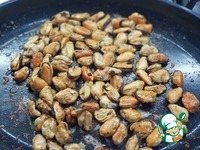 Кидаем размороженные мидии на разогретую сковородку. Огонь выше среднего. |