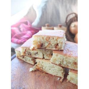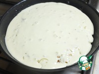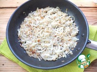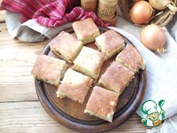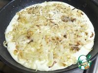 Лук выкладываем на тарелку. На горячую сковороду выливаем половину теста. Выкладываем лук. |