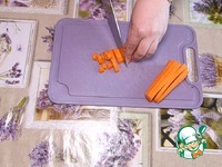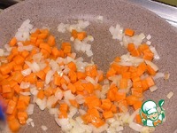 В сковороду наливаем растительное масло и нагреваем. Добавляем лук, обжариваем 1-2 минуты до полупрозрачности. Добавляем морковь, обжариваем еще 1-2- минуты. |