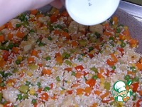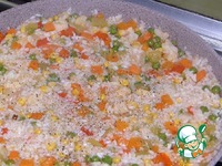 Тем временем рис промываем под проточной водой и откидываем на сито, чтоб стекла вода. Далее добавляем рис к овощам и обжариваем с овощами 2 минуты. Солим рис по вкусу. |