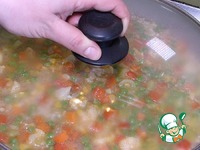 Через 2 минуты вливаем кипяток, перемешиваем. Накрываем крышкой и убавляем огонь до минимума. Тушим примерно 10-15 минут (у меня заняло 12 минут) периодически помешивая до выпаривания жидкости. |