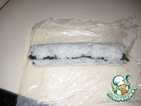следующий шаг. нам нужно перевернуть водоросли с рисом "наизнанку" ( маленький секрет, чтобы рис не прилип, коврик для суши, нужно обернуть пищевой пленкой) |