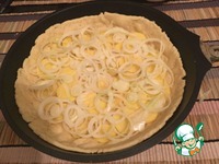 На основу для пирога выложить нарезанный картофель (слегка присолить), затем слой лука. |