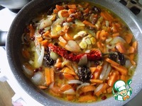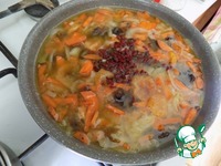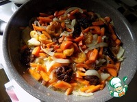 Далее выкладываем сухофрукты и обжариваем их вместе с луком, убавив огонь до среднего и тоже периодически мешая. Очередь моркови. Всё обжариваем на среднем огне до полу-готовности. |