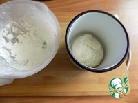 Скатываем в шар, перекладываем в эмалированную посуду или смазанную маслом, любую. Ставим в тёплое место минут на 30. Я грею немного духовку. У меня электрическая. |