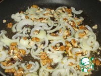 Разогреваем в сковороде растительное масло и поджариваем лук и орехи. |