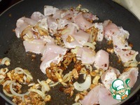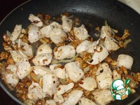 Когда лук и орехи станут золотистыми и пойдет приятный аромат поджаренного лука добавляем в сковородку филе. |
