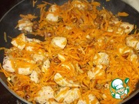 Лук режем полукольцами, морковь трем на крупной терке, филе нарезаем произвольными кусками, орехи измельчаем не сильно мелко. |