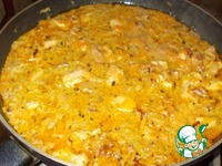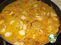 Заливаем филе подготовленной смесью. Перемешиваем. Закипает содержимое практически моментально. Делаем маленький огонь. Накрываем крышкой и протушиваем 10-12 минут. |