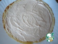 Уложите первый блин на блюдо, на котором вы собираетесь подавать пирог. Промажьте рыбным муссом и уложите на него второй блин. |