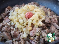 Добавить к печени помидоры, томатную пасту, сахар, черный молотый перец. Соль я не добавляю, на мой вкус её здесь достаточно. |