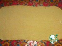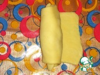Подошедшее тесто разделить на 2 части. Каждую часть тонко раскатать. |