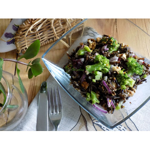 Описание: Черный рис не входит в число распространенных продуктов питания. Он не состоит в родстве с хорошо знакомым нам злаком. Это очень полезный продукт, особенно в дни Поста. В отличие от распространенных культур черный рис отличается большим количеством питательных веществ. На сто грамм продукта содержится около 20 грамм белка и почти дневная норма фолиевой кислоты. Это в несколько раз больше, чем в любом другом виде. Этот продукт в пост нам заменит животный белок. Брокколи тоже очень известна своими полезными свойствами. Конечно же: орехи, клюква, масло оливковое и мёд. В общем! САЛАТ ОЧЕНЬ ПОЛЕЗНЫЙ И ВКУСНЫЙ!