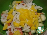 Туда же всыпать половинку нарезанного кусочками болгарского перца, лучше желтого цвета, но можно и красного. |
